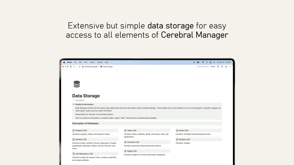 Inspired by the Second Brain methodology, Cerebral Manager is a complete productivity and digital management system. Designed to unclutter our cluttered lives, the goal of Cerebral Manager is simple: provide a straightforward system to organize everyday life.