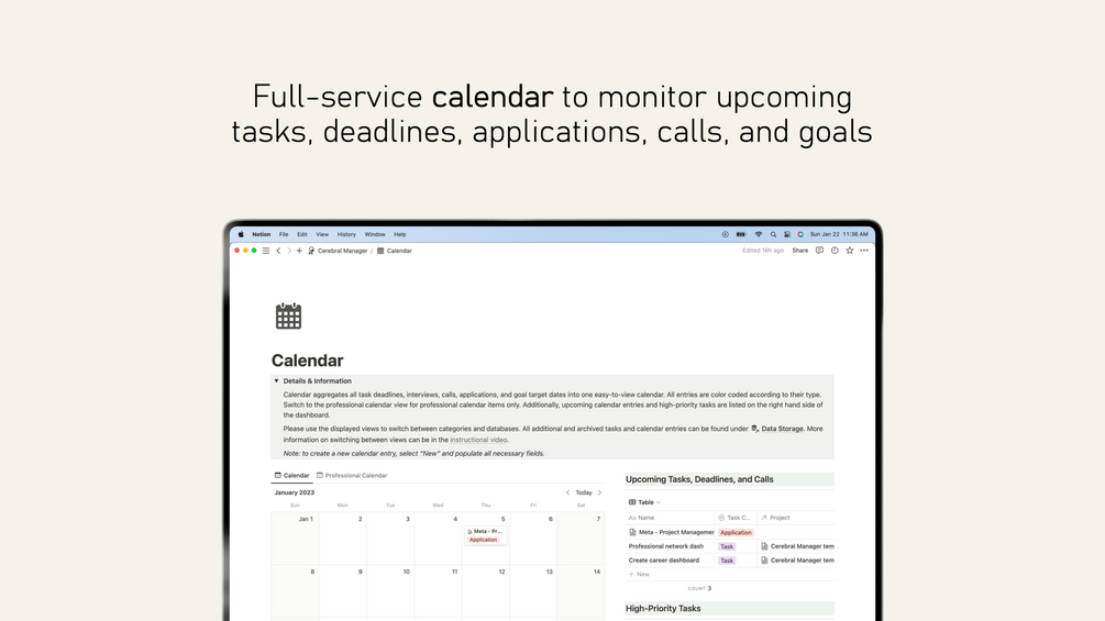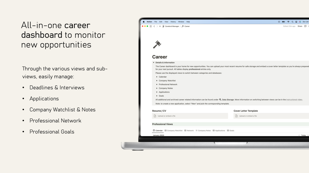 - Career dashboard designed for new opportunities, complete with an application tracker, professional calendar, company watchlist, professional contacts hub, and professional goals database.