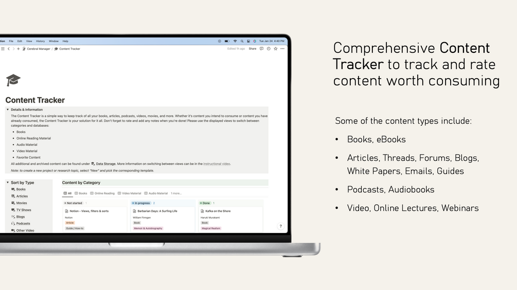 - Content tracker to manage your books, articles, podcasts, videos, and more.