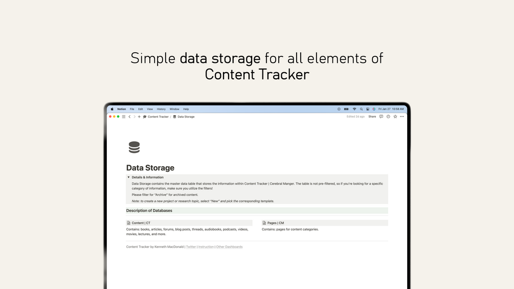 Content Tracker is part of the Cerebral Manager Ecosystem. If you enjoy this template, please check out my others: https://kmacdonald.gumroad.com/