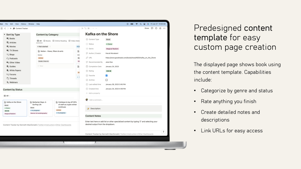Content Tracker is a simple but effective content and entertainment tracker for Notion. Record and document books, audiobooks, articles, TV shows, movies, blogs, podcasts, guides, and more with the predesigned template. Easily take notes and categorize by status, genre, type, and rating.